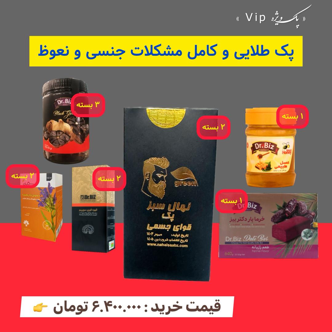 این پک جنسی شامل؛ محصولاتی همچون قهوه گانودرما سوپریم، سیر سیاه دکتر بیز، خرمابار تقویتی بیز و عسل طبیعی بیز میباشد و در کنار آن پودر گیاهی جسمی نهال سبز برای اصلاح مزاج و تقویت نعوظ موجود است ( ۵ قوطی ۳گرمی شوک + ۵ قوطی ۳گرمی تقویتی ویژه رابطه + ۵گرم شیرکوه )